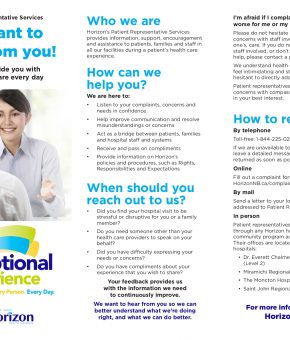 Patient representatives are accessible through any Horizon hospital, health centre or community program across New Brunswick. Their offices are located at the following hospitals: